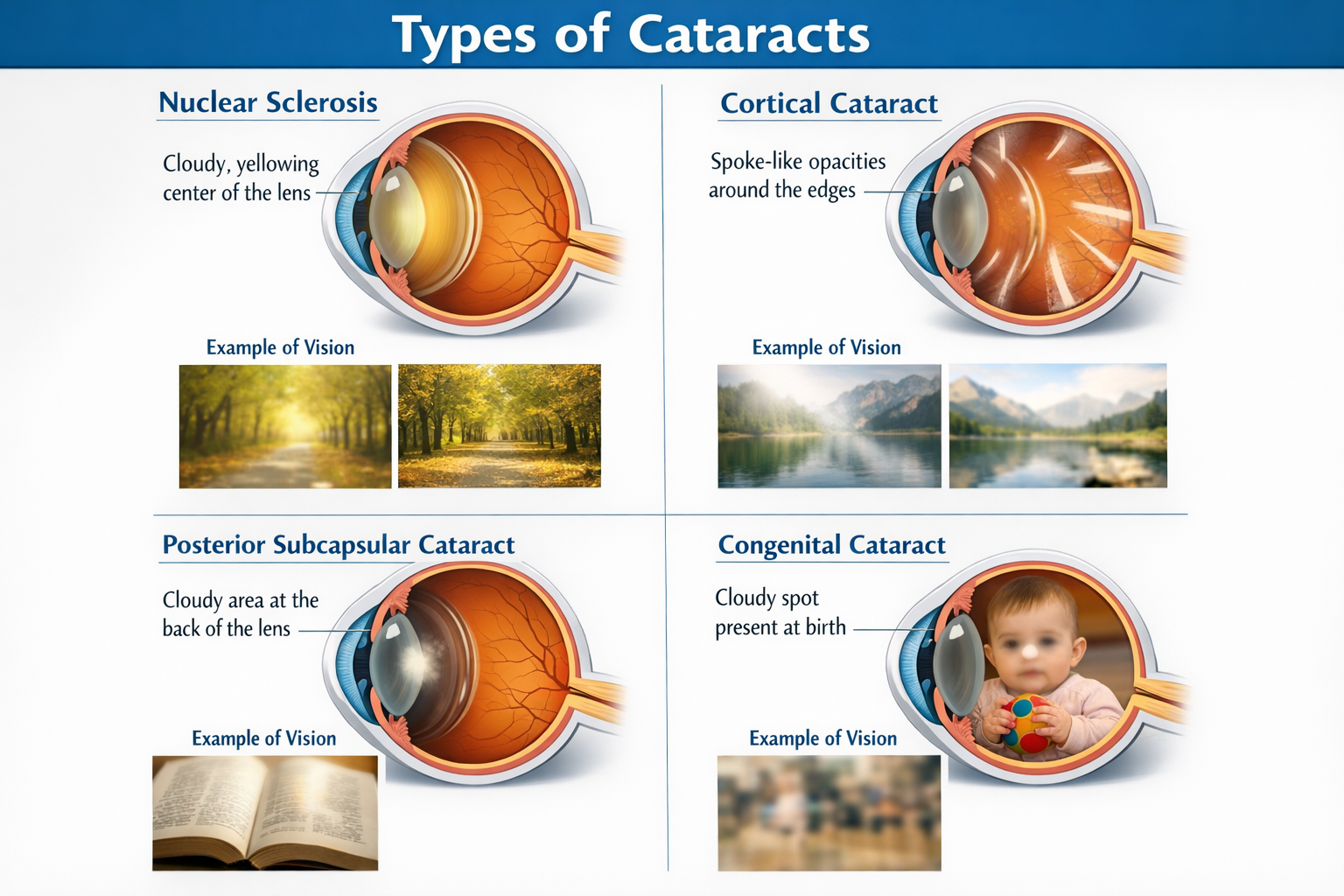 There are different types of cataracts, such as: