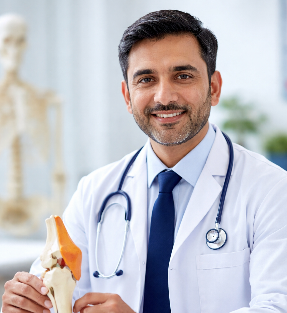 Photo Suggestion: Use a stock/AI doctor photo — male doctor with orthopedic models (AI placeholder)