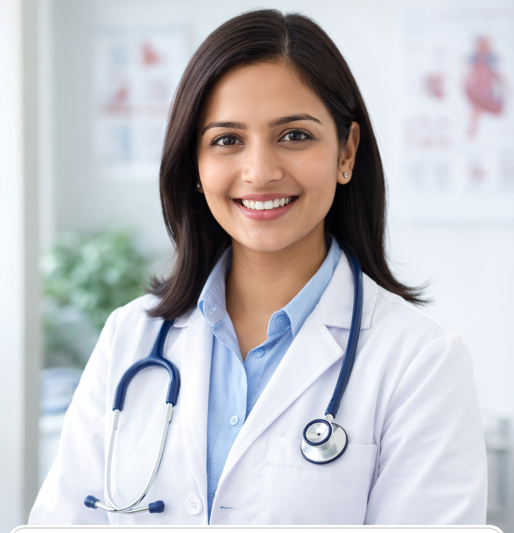 Dr. Ananya Roy Specialty: Cardiology Qualifications: MBBS, MD (Cardiology) Experience: 12 years About: Dr. Roy specializes in cardiac care and preventive heart health. Known for compassionate patient communication. Photo Suggestion: Use a professional stock/photo of a smiling female doctor in a white coat with stethoscope (AI placeholder) for her genetate face image