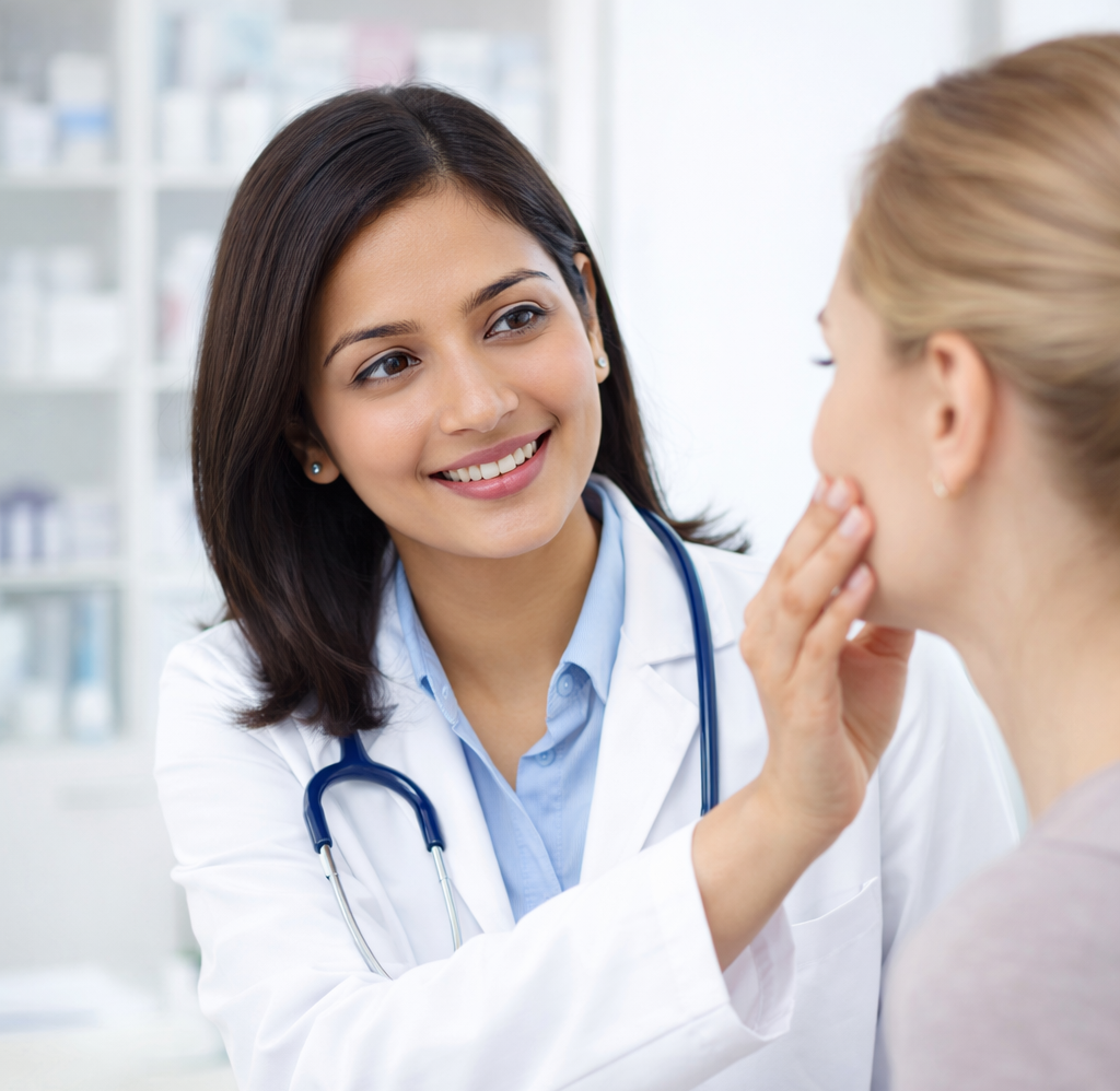 Specialty: Dermatologist Qualifications: MBBS, DNB (Dermatology) Experience: 8 years About: Focus on cosmetic dermatology and skin health for all ages. Photo Suggestion: AI-style stock image — female dermatologist consulting with a patient her face caed image