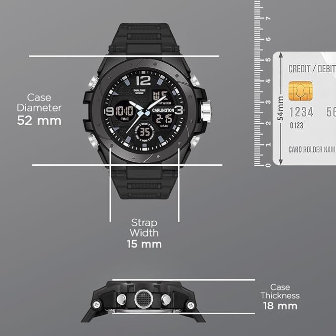- MEASUREMENTS – This analog-digital watch with a 52 mm diameter, protected by scratch-resistant mineral glass. It weighs around 82 g and has a 3-hand analog quartz movement. The strap provides a comfortable fit for everyday wear.