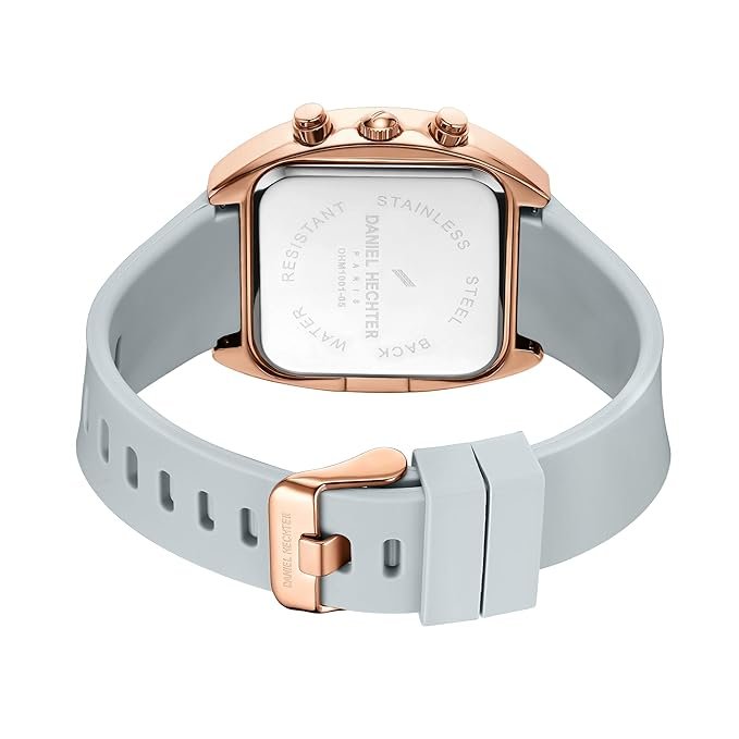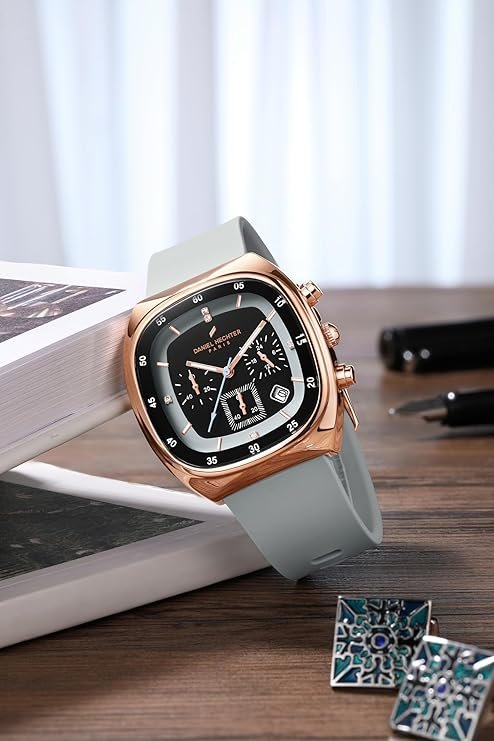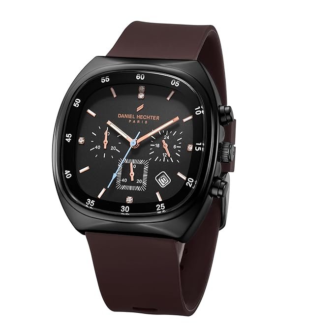 - Brand & Design: Daniel Hechter Paris men’s chronograph watch with a modern cushion-shaped black stainless steel case.
