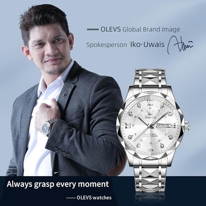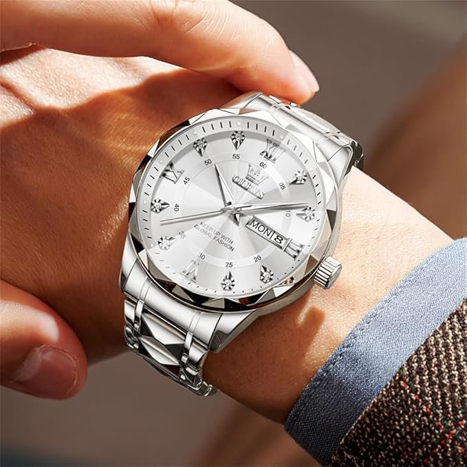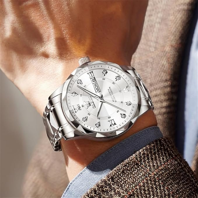 - ⌚Luxurious Business Design:Boasting a sophisticated business design, this watch features luxurious diamond accents and elegant Roman numeral hour markers. Dual date windows enhance its practicality and style, making it the perfect accessory for any occasion.
