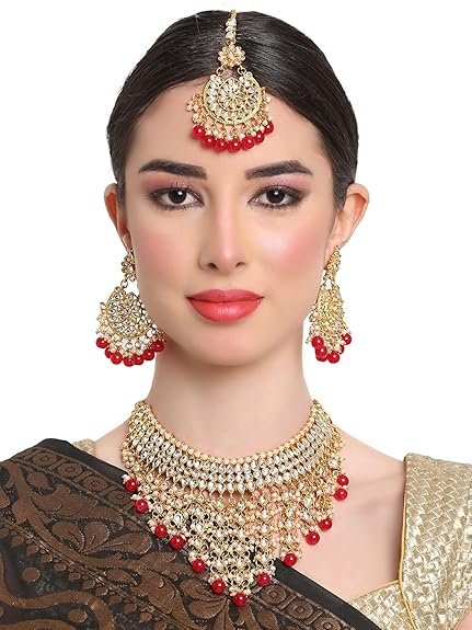 Shining Diva presents this latest design jewellery set stylish Gold Plated Kundan Choker Necklace Set with earrings and Maang Tikka. This fancy bridal wedding party wear bridal choker neckless Jewellery set for girls and women is made of Kundan which looks stylish and goes perfect with any attire. This latest design kundans jewellery set for women is perfectly suited for bridal wedding or party wear. Shining Diva is a well known brand across fashion jewellery sector. Shining Diva has huge collection of latest statement necklace jewellery, traditional necklace set, pendant set and other jewellery accessories which includes fancy bangles for women, wedding bangles, ear cuffs, traditional bangles kada, neck choker, fashion party wear necklace for girls and jhumki jhumka earrings. Shining Diva is pioneer of Imitation jewellery and designer pearl necklace set for women and American diamond hangings fancy party wear stylish Earrings. Shining Diva Fashion and Traditional jewellery give true value for your money.