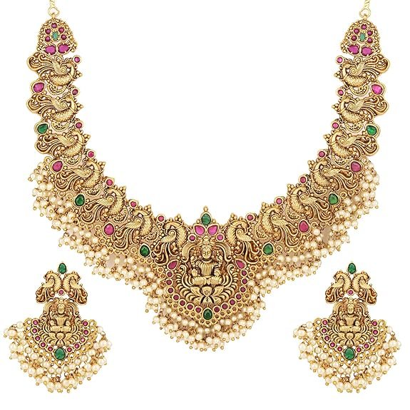 - Perfect festive or wedding party necklace jewellery. Prep up your traditional look with this gold-plated jewellery set. This set will complement your attire and show-off your unique fashion sense
