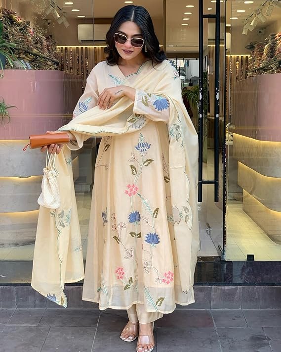 GoSriKi Women’s Elegant Chanderi Cotton Embroidered Anarkali Kurta Set with Dupatta for Women | Light Floral Print Suit for Wedding, Parties & Daily Use