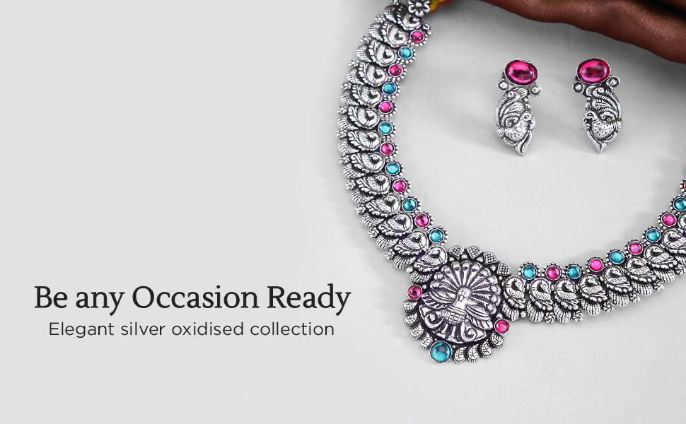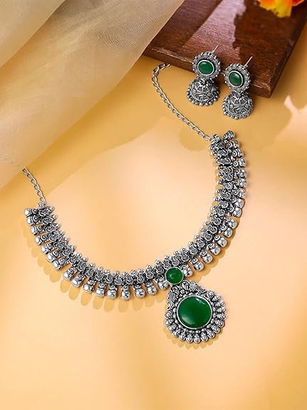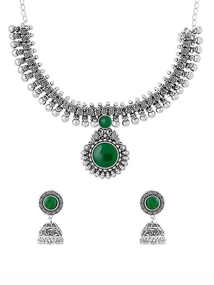 - Classic silver oxidized Necklace set for women- a stylish contemporary latest antique vintage kolhapuri green stone Necklace Set with Jhumka Earrings stunning & preciously suitable fabulous match for all your special occasions,events & festivals.Our Product is perfect for valentines Anniversary Birthday gift for Women,girlfriend,Wife.